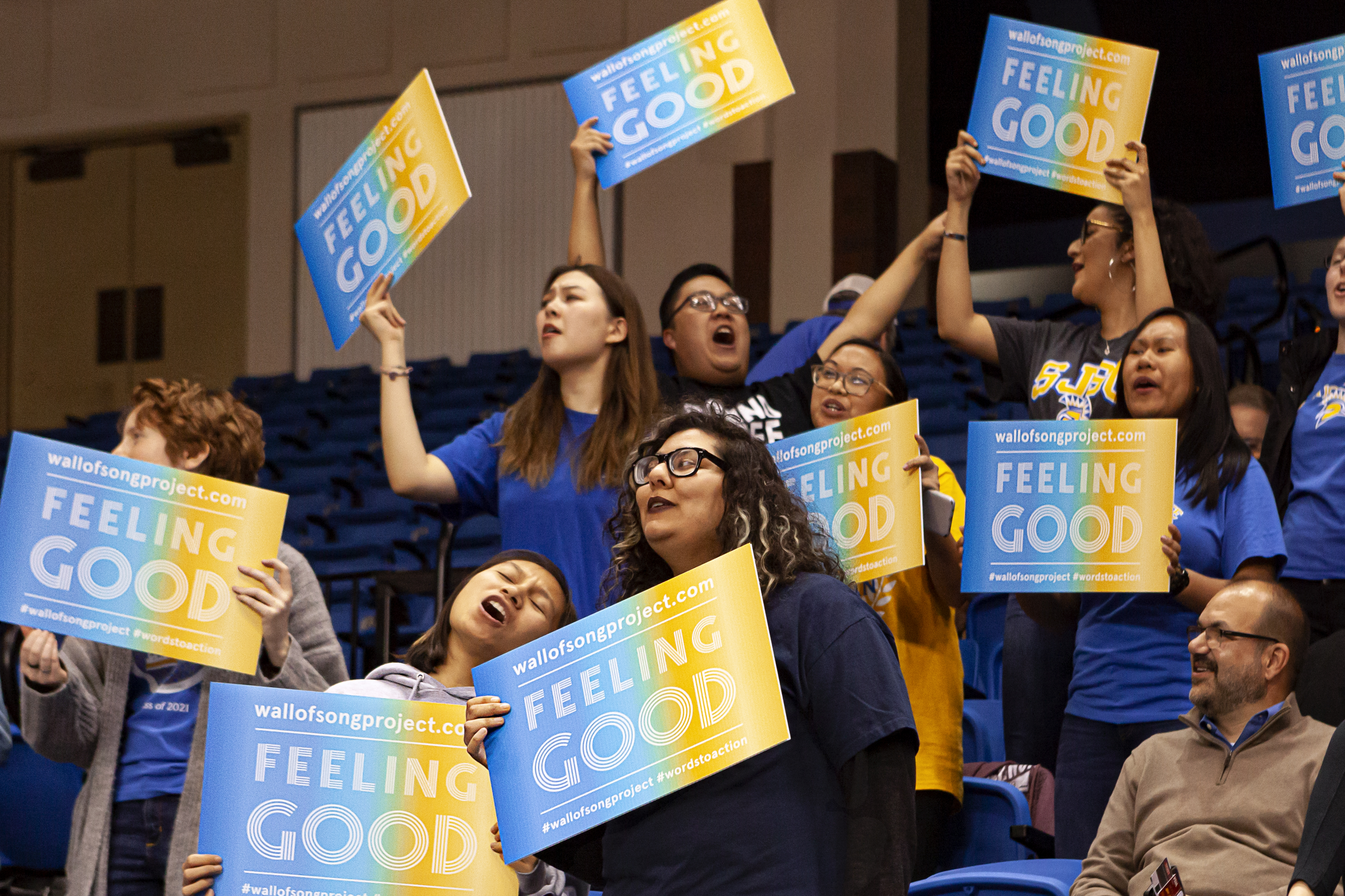 The Wall of Song project is participatory and interactive. The first step invites athletes, fans, students, and community supporters to sing “Feeling Good” online at https://wallofsongproject.com/.... It only takes a few minutes and you don’t need to be able to sing–it’s not a solo!