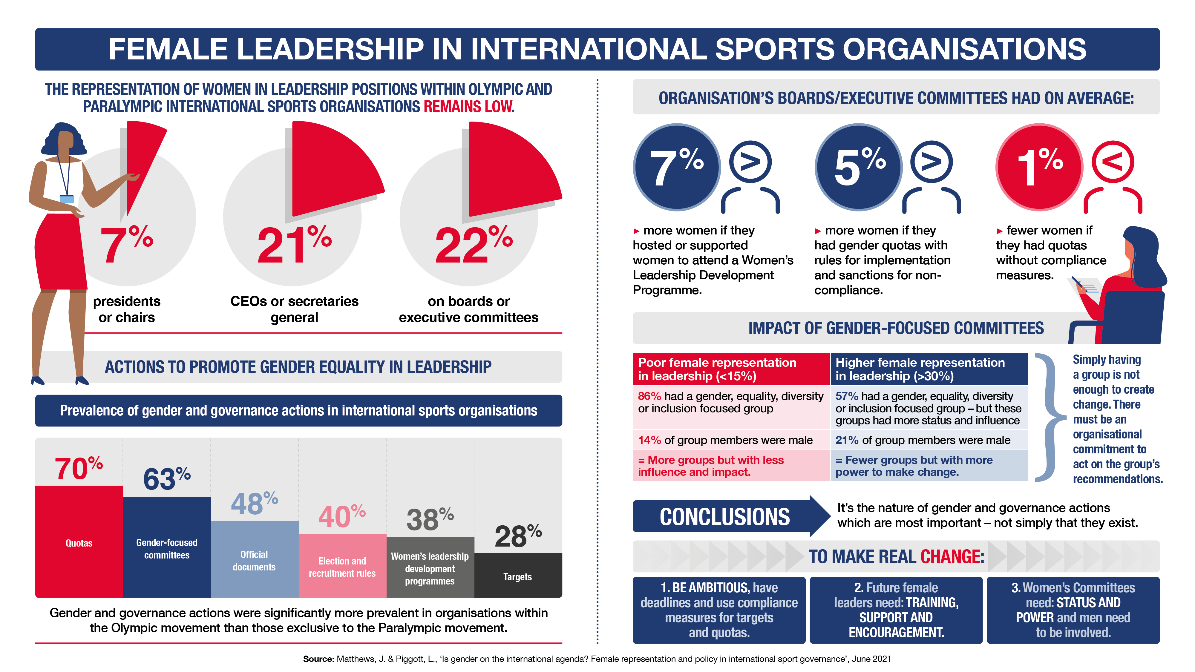 This research shows that gender and governance action will only be effective in increasing female representation within the governance of international sport organisations if organisations implement actions that are ambitious, process-driven, and embedded across the organisation. It is also important that organisations demonstrate a genuine commitment to achieving these gender and governance actions and that increased female representation is combined with a change to the gendered system of sports organisations. This is to ensure that women decision-makers are not just represented but have the power to influence the governance of international sports organisations.